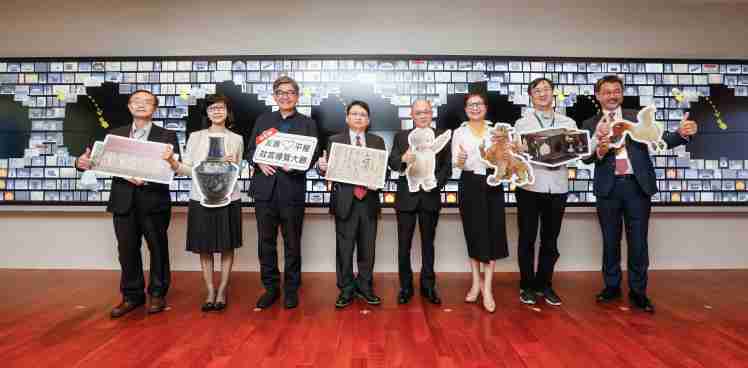 欧陆注册携手创利空间为故宫建置的智慧文物互动导览墙及轮播墙,,,,今日正式启用。。。。(左四:欧陆注册新事业暨投资管理总部副总经理杨本豫、、、右四:故宫博物院院长吴密察、、、、右三:太极影音董事长黄宝云)