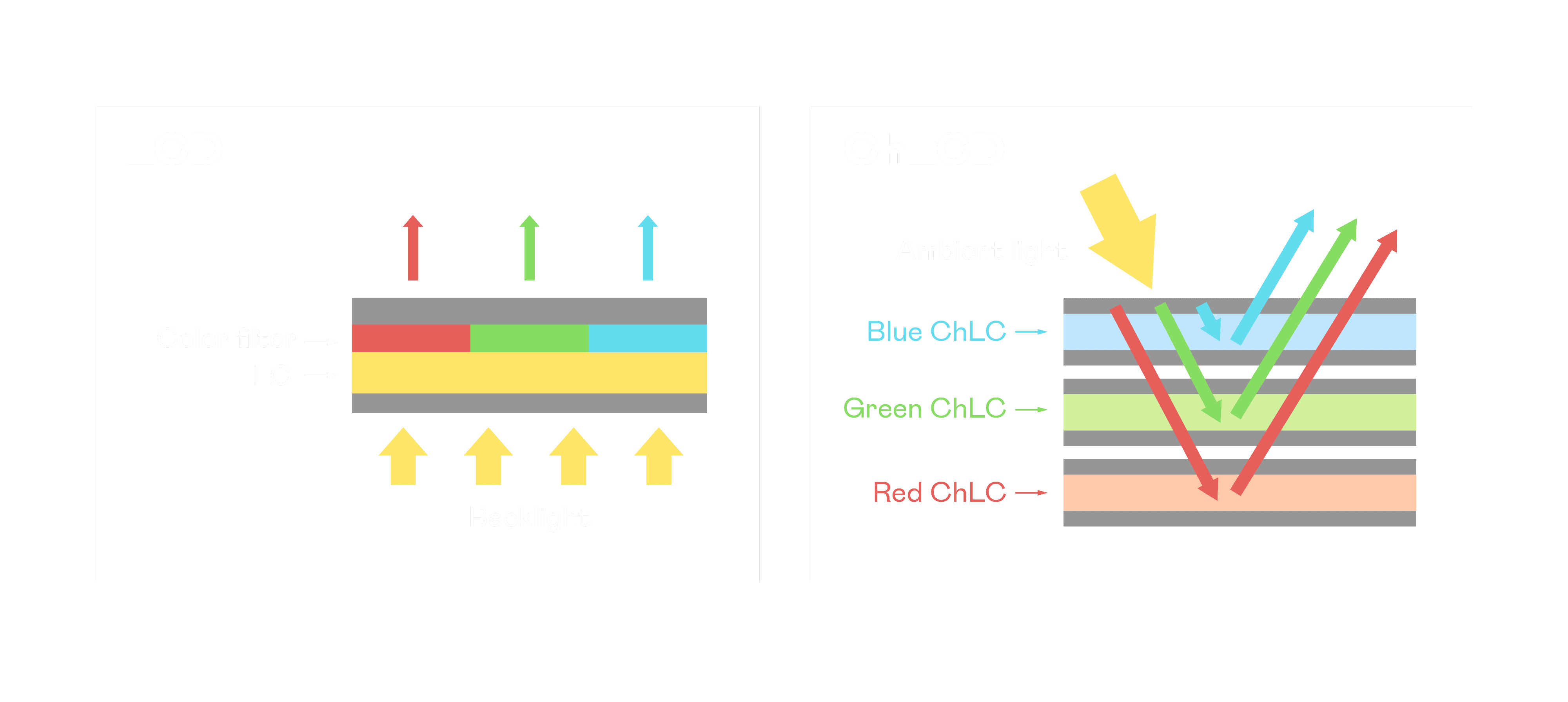ChLCD 胆固醇液晶就如同纸张一样,,,,透过反射环境光来显示影像,,,因此长时间观看不易造成人眼视觉疲劳,,可达到护眼效果。。当处于户外阳光下使用,,LCD 影像容易失真而不易观看,,但胆固醇液晶仍可维持较佳的影像品质。。